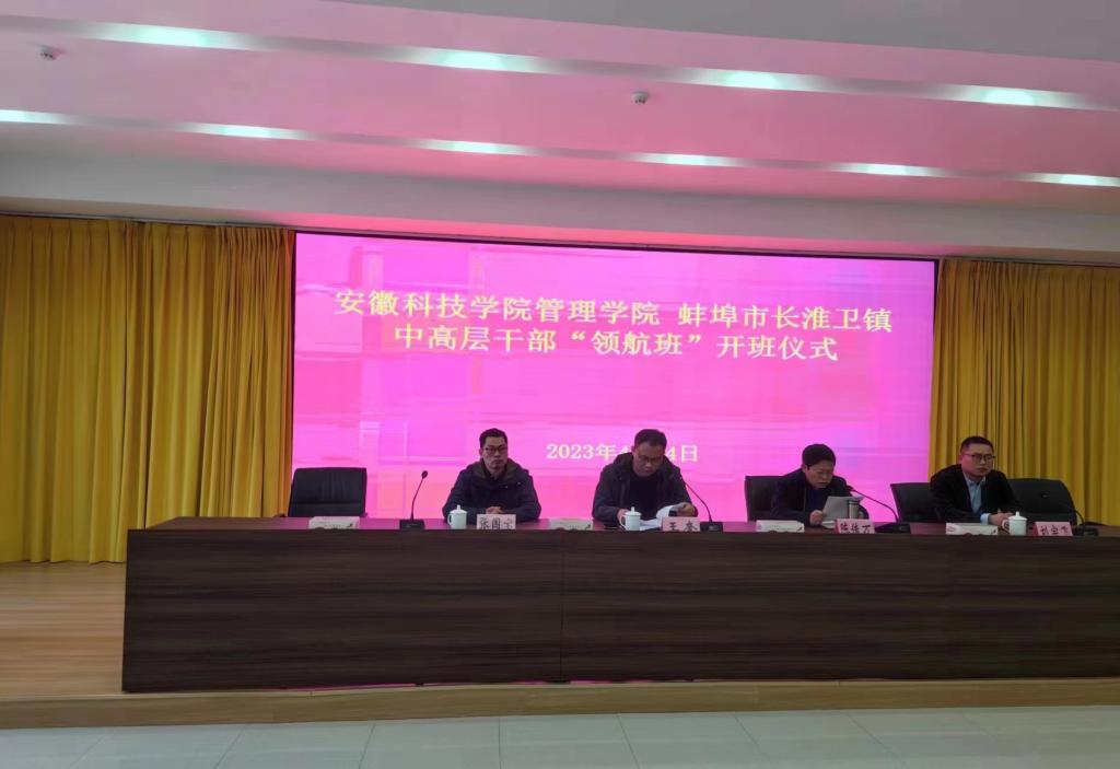 为全面助推乡村振兴,服务地方经济与社会发展,综合提升中高层干部能力素质,继3月初圆满完成的长淮卫镇青年干部“启航”技能提升服务项目后,我校管理学院为长淮卫镇量身打造的中高层干部“领航”技能提升服务项目启动仪式于4月14号上午在长淮卫镇人民政府五楼1号会议室如期举行。长淮卫镇党委副书记王奎,管理学院院长陈传万、副院长张国宝、营销系主任刘宗飞出席启动仪式。启动仪式由王奎主持。