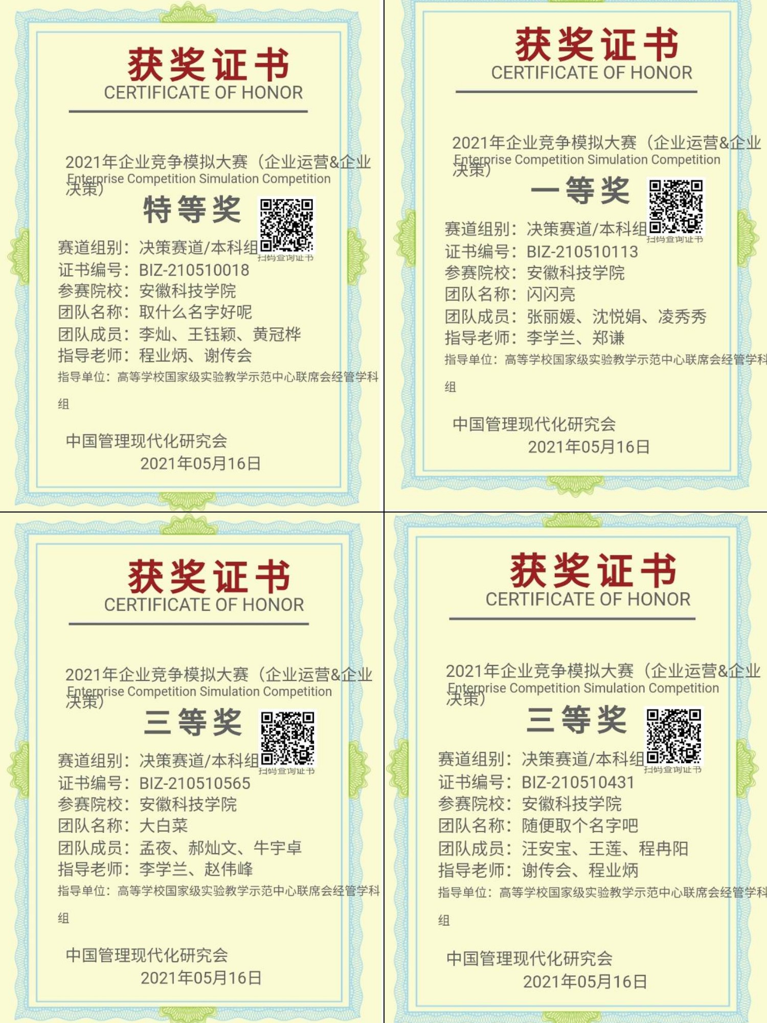 5月16日,从天津工业大学承办的全国企业竞争模拟大赛总决赛传来喜讯,我校代表队荣获特等奖1项(李灿、王钰颍、黄冠桦团队)、一等奖1项(张丽媛、沈悦娟、凌秀秀团队)、三等奖2项(孟夜、郝灿文、牛宇卓团队和汪安宝、王莲、程冉阳团队),取得此类学科赛事的历史突破。