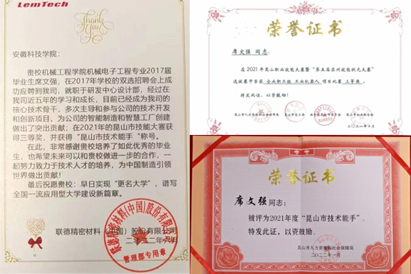 日前,总部位于江苏省昆山市的联德精密材料(中国)股份有限公司向博鱼官方网页版_博鱼(中国)发来热情洋溢的工作喜报,“贵校机械工程学院机械电子工程专业2017届毕业生席文强,在2017年学校的双选会上成功应聘到我司,就职于研发中心设计部,经过在我司近五年的学习和成长,目前已成为我司的核心技术骨干,多次主导和参与公司的技术开发和创新项目,为公司的智能制造和智慧工厂创建做出了突出贡献;在2021年的昆山市技能大赛上荣获三等奖,并获得‘昆山市技术能手’称号。在此,非常感谢贵校培养了如此优秀的毕业生,也希望未来可以和贵校做进一步的合作,一起努力致力于技术人才的培养,为中国制造引领世界做出贡献!最后祝愿贵校:早日实现‘更名大学’,谱写全国一流应用型大学建设新篇章。”