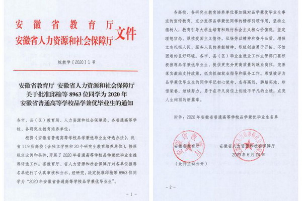 日前,安徽省教育厅、安徽省人力资源和社会保障厅下发了《关于批准邱榆等8963位同学为2020年安徽省普通高等学校品学兼优毕业生的通知》(皖教学〔2020〕1号),我校曹强等146名同学被授予“2020年安徽省普通高等学校品学兼优毕业生”荣誉称号。