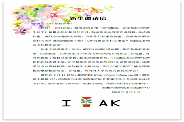 2018年,易班初建,新生第一次在通知书中收到纸质安科易班邀请函,学校充分利用易班线上平台资源,利用开展涵盖社会主义核心价值观教育、国防教育、理想信念教育、诚信文明教育等在内的新生入学教育,易班的介入,不但提前了新生入学教育的时间线,也有效提升学习教育覆盖面,创新教育形式,有效提升了教育效果,新生们第一次在进校前就参与了校园生活。