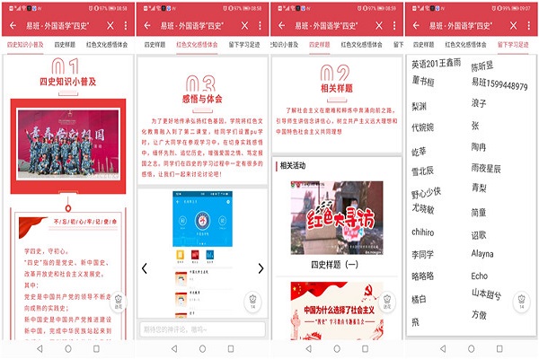 学院分团委利用易班优课、发动班级团支部开展主题团日活动的形式来号召全院参与学习“四史”,以此来提高全院学生对党史、新中国史、改革开放史、社会主义发展史的认识,学习伟人志士励志进取、勇于创新、忠心报国的事迹,树立革命乐观精神,弘扬爱国主义精神。