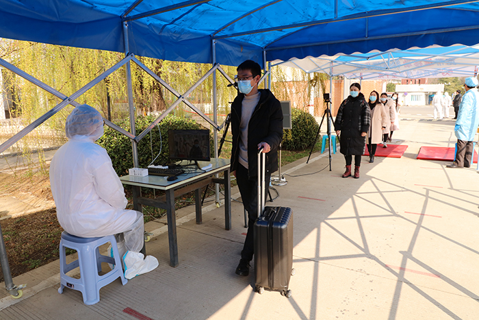 在学生进校测量体温环节,医务人员发现体温异常学生后,立即指引该生径直到临时医疗观察点,由应急处置医务人员进行体温复测和调查。如复测体温仍异常,医务人员立即联系定点医院,安排专车送院就诊,同时报告上级领导,相关工作人员对现场学生进行信息登记,对物品与环境进行彻底消毒,对密切接触者进行隔离,并通知学生家长。