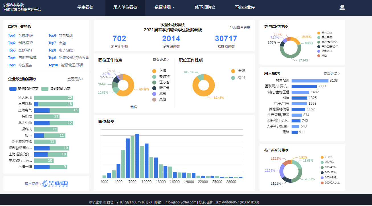 根据2018-2020三个年度毕业生就业质量报告,我校毕业生省外就业主要面向长三角核心地区,其中,在沪就业比例一直在10%以上。毕业生去向就是就业工作取向,学校加强长三角区域就业布局,作为毕业生就业工作的重点布局领域。2020年下半年疫情缓解以来,学校积极与上海学生事务中心联络,继续拓展合作领域,截至2021届毕业生离校时,先后举办“多方联动、聚力就业”上海市2021届高校毕业生春季“安科之生”专场招聘会、“安科之生”春季就业冲刺月(互联网专场)、高校毕业生就业促进周2021年“安科之生”专场、毕业季“安科之生”专场、长三角招聘会博鱼官方网页版_博鱼(中国)“海聚英才”2021年离校未就业毕业生专场云聘会、长三角“安科之生”2021届毕业生离校未就业专场,6个场次共有36345次访问记录,投递简历2033份,702家用人单位共发布5007个职位,73865个岗位,涉及机械制造、制药医疗、互联网等诸多行业领域,涵盖了数字经济、电子信息、新材料等重点发展产业,为毕业生融入长三角区域就业提供了广阔的双选平台。(特约通讯员:司萍 审核:施培智 编辑:张威)