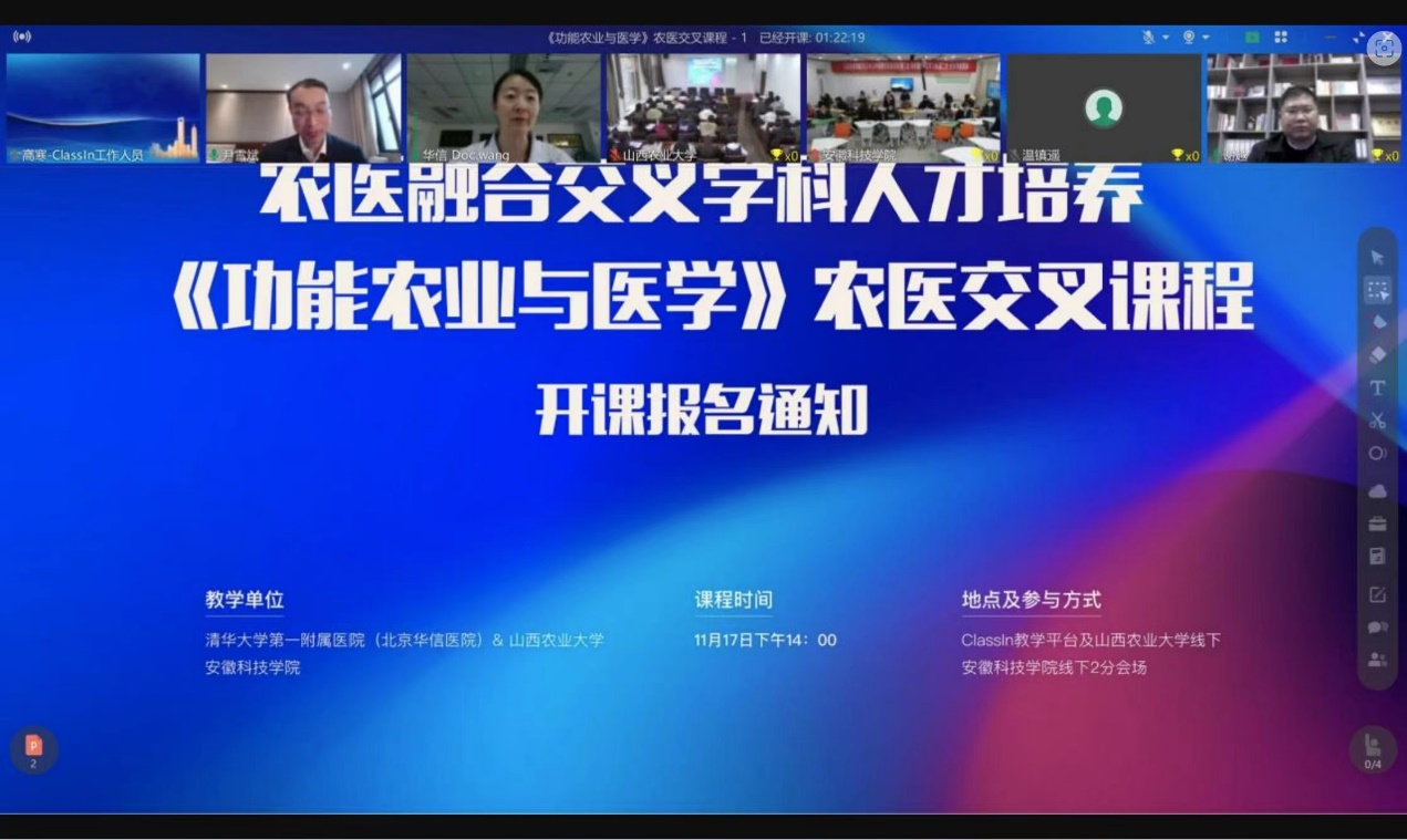 近日,我校与清华大学第一附属医院、山西农业大学合作举办了农医融合交叉学科人才培养课程首次授课。该课程由清华大学第一附属医院心血管内科副主任医师王晶、博鱼官方网页版_博鱼(中国)长三角功能农业(食品)研究院院长尹雪斌教授联合讲授。这也是《功能农业与医学》农医融合交叉第一课。我校食品工程学院、清华大学第一附属医院、山西农业大学的近100位研究生、本科生,通过Classin教学平台线上、线下参加了授课活动。
