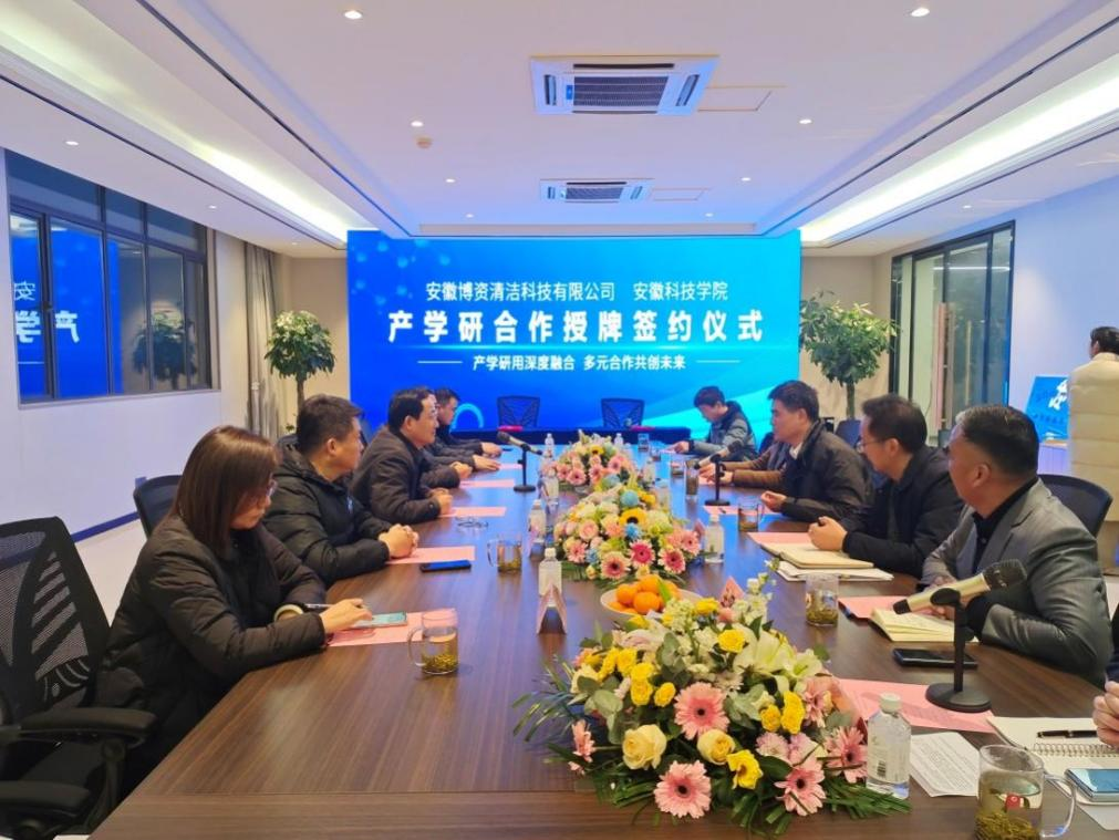 2022年12月6日,博鱼官方网页版_博鱼(中国)党委委员、纪委书记、监察专员王强、化学与材料工程学院党委书记黄树桥、副院长(主持工作)李子荣、应用化学系刘川副教授、吴际伟博士等一行5人赴安徽博资清洁科技有限公司就开展校企合作对接活动。本次对接活动受到安徽博资清洁科技有限公司总经理王汉民、副总经理王雪飞的热情接待,苏滁高新区党工委委员、纪律监察工委书记朱发贵,苏滁高新区党工委委员管委会副主任赵永滨,以及苏滁高新区经济运行局、环保局、企业发展中心等部门负责人参加了座谈和签约仪式。