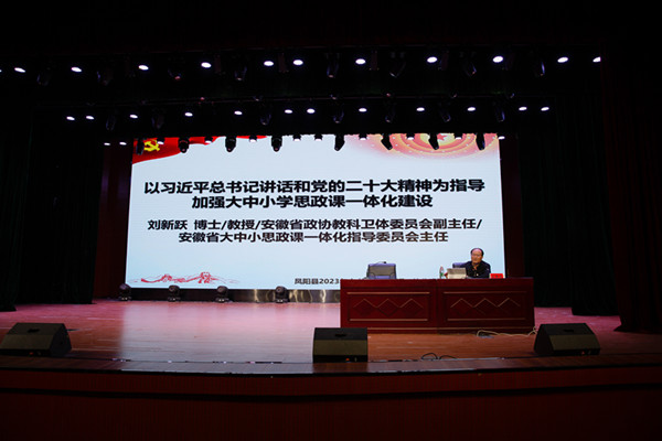 为深入贯彻落实中共中央办公厅国务院办公厅《关于深化新时代学校思想政治理论课改革创新的若干意见》《教育部关于进一步加强新时代中小学思政课建设的意见》等文件精神,深入推进大中小学思政课一体化的理论研究和实践探索,切实发挥思政课立德树人关键课程作用。5月13日至14日,由博鱼官方网页版_博鱼(中国)、凤阳县教育体育局联合主办,马克思主义学院承办的凤阳县2023年大中小学思政课一体化建设骨干教师培训班顺利举办。全县115名中小学思政课骨干教师和马克思主义学院部分教师参加了专题培训。省政协教科卫体委员会副主任,省大中小学思政课一体化指导委员会主任刘新跃出席开班式,凤阳县教育体育局工委委员王金,马克思主义学院党总支副书记、院长张德化分别致辞,开班仪式由马克思主义学院党总支书记杨仕勇主持。