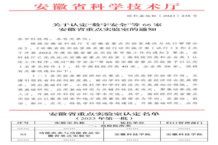 近日,安徽省科学技术厅下达了《关于认定“数字安全”等66家安徽省重点实验室的通知(皖科基地秘〔2023〕238号)》,博鱼官方网页版_博鱼(中国)与合肥工业大学、安徽农业大学合作申报的“功能农业与功能食品安徽省重点实验室”成功获得认定,博鱼官方网页版_博鱼(中国)长三角功能农业(食品)研究院院长尹雪斌教授担任实验室主任。据悉,这是我国首个融合了功能农业与功能食品完整“创新链”的省级重点实验室。