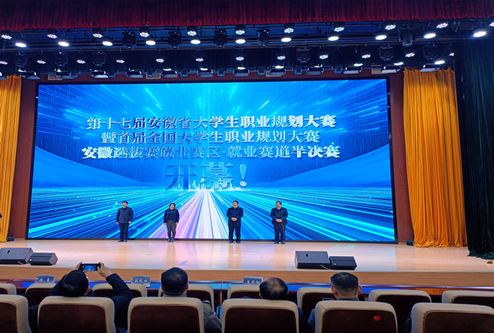 12月13日,第十七届安徽省大学生职业规划大赛暨首届全国大学生职业规划大赛安徽赛区皖北片区就业赛道半决赛在我校龙湖校区开幕。省大中专毕业生就业指导中心主任张秋田,校党委书记时伟,党委委员、副院长李升和出席开幕式。