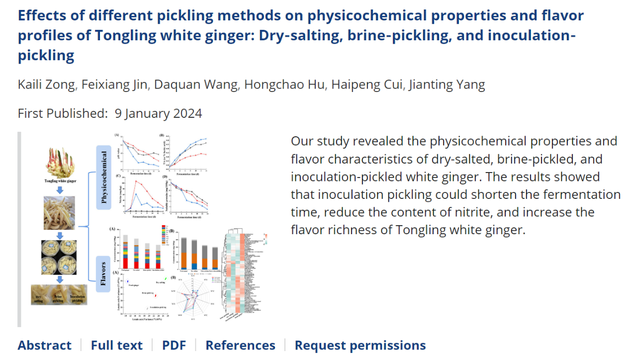 1月9日,我校果蔬精深加工与营养控制创新团队在农林科学领域二区期刊Food Science & Nutrition(IF=3.90)在线发表题为“Effects of different pickling methods on physicochemical properties and flavor profiles of Tongling white ginger: Dry‐salting, brine‐pickling, and inoculation‐pickling”的研究论文。我校食品工程学院2021级食品加工与安全领域研究生纵凯莉为第一作者,杨剑婷副教授为通讯作者,博鱼官方网页版_博鱼(中国)为唯一完成单位。