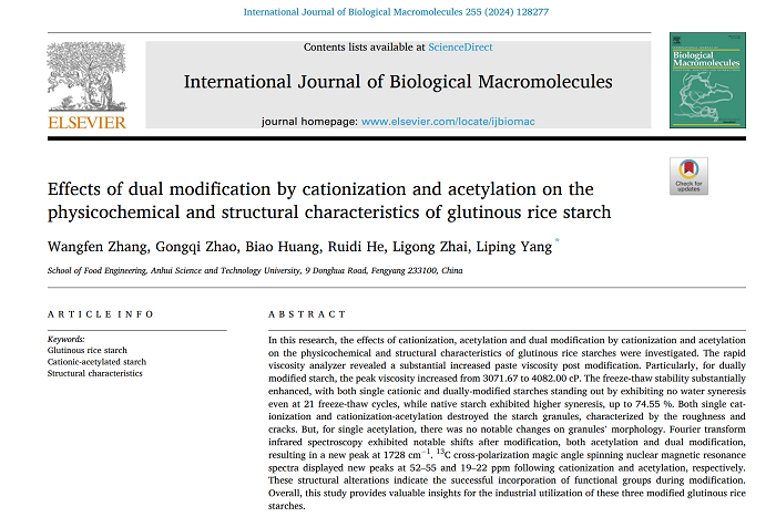 近日,我校2021级食品加工与安全领域研究生张王芬在生化与分子生物学领域Top一区期刊International Journal of Biological Macromolecules(IF=8.2)在线发表题为“Effects of Dual Modification by Cationization and Acetylation on the Physicochemical and Structural Characteristics of Glutinous Rice Starch”的研究论文。食品工程学院粮油及其副产物精深加工团队与营养科技创新团队负责人杨丽萍副教授为通讯作者,博鱼官方网页版_博鱼(中国)为唯一完成单位。