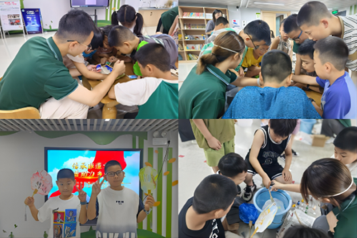 “普中华之音”团队还结合广德市的地域文化特色,将普通话推广与非遗文化传承相结合。在“暑期七彩课堂”中,团队成员们不仅向孩子们普及了普通话知识,还介绍了广德市的非遗项目。在漆扇的制作活动中,团队成员指导孩子们将古诗词写在扇面上、书签上,引导孩子们充分发挥想象,用古诗词来描述自己所制作的图案,一位10岁小朋友用“大漠孤烟直,唱歌落日圆”描述小组制作的落日图,一位小朋友用“安得五彩虹,驾天作长桥”形容“彩虹图”。并通过互动体验的方式让孩子们亲身感受传统文化的魅力。这种跨界融合的方式不仅丰富了活动内容,也进一步提升了普通话推广的吸引力和影响力。