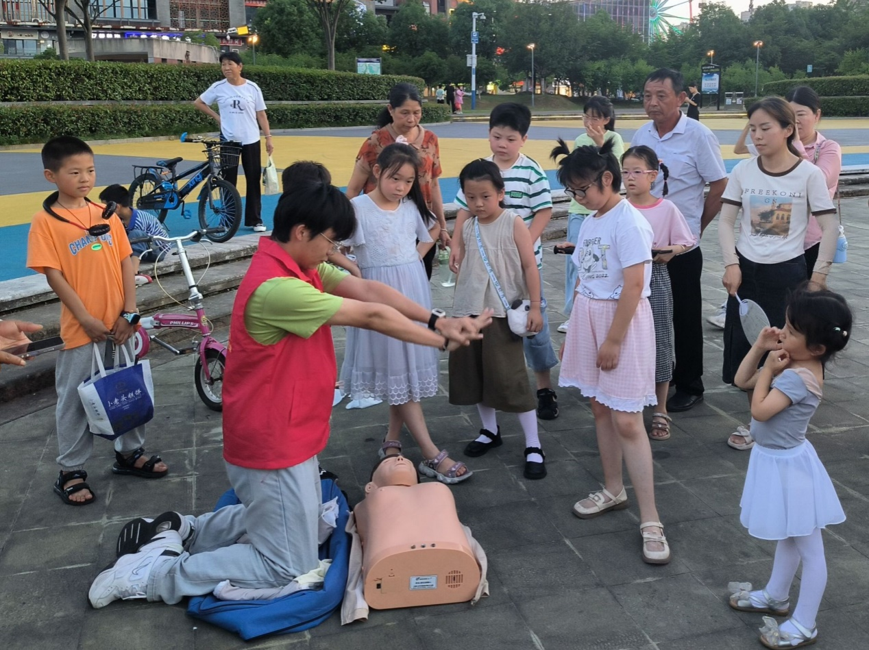 团队成员结合自身专业知识并通过发放精心制作的健康宣传资料,宣传资料涵盖了各种健康主题,包括日常保健常识、常见疾病的预防和应对方法、合理用药知识、营养饮食指南等,居民们可以在闲暇时间翻阅这些资料,进一步巩固和加深对健康知识的理解。为进一步提升群众面对突发事件、意外伤害的应急意识和自救互救能力,普及应急救援知识,团队成员在桂花广场进行心肺复苏和海姆立克等急救技能实践操作宣传。持有“红十字救护员证”的老师和志愿者为大家详细讲解了心肺复苏等急救技能的重要性和操作要点。通过现场演示,向居民耐心地讲解每个步骤的要领,“首先,要判断患者是否有意识和呼吸,然后迅速呼叫救援……”居民们围拢在周围,聚精会神地聆听。团队成员示范结束后,居民们纷纷踊跃尝试,在团队成员的指导下居民们从一开始的生疏到逐渐熟练,他们脸上洋溢着收获知识的喜悦。一位参与体验的居民表示:“以前总觉得这些急救技能离我们很远,今天亲身体验后才发现其实只要掌握了方法,我们也能在关键时刻救人一命。”活动现场气氛热烈,大家纷纷表示受益匪浅,希望今后更多这样的实践活动能够走进社区。
