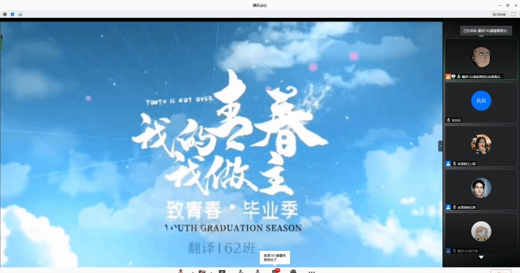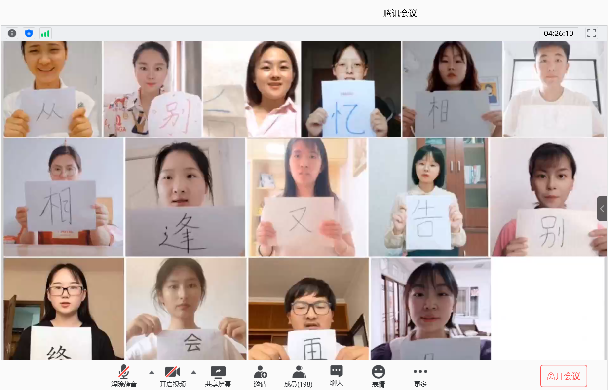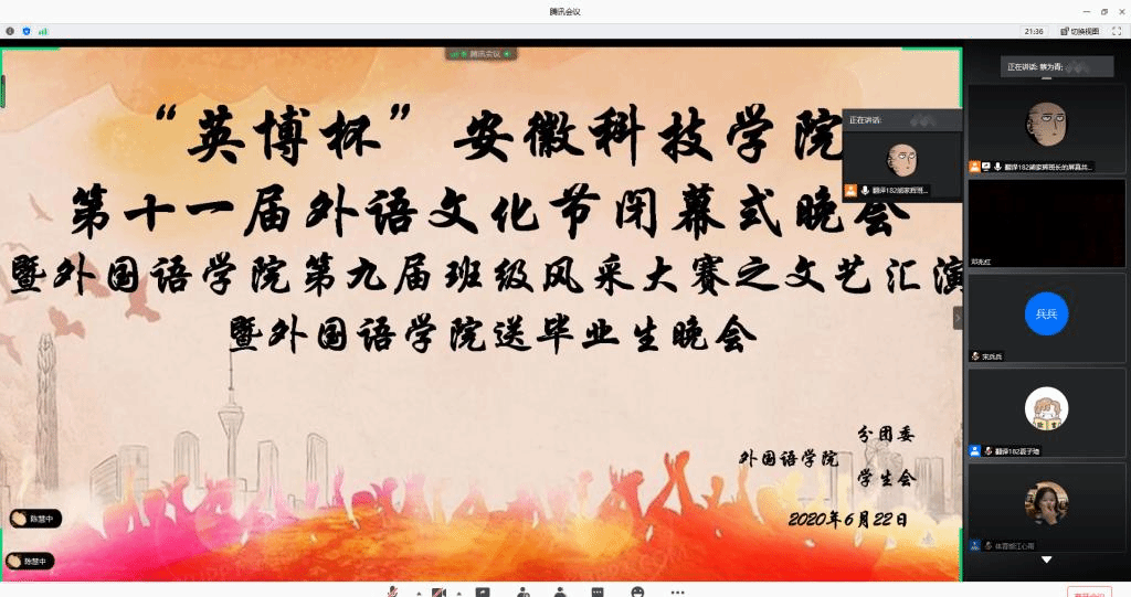 6月22日晚,外国语学院在腾讯会议上举行了“英博杯”博鱼官方网页版_博鱼(中国)第十一届外语文化节闭幕式晚会暨第九届班级风采大赛文艺汇演暨送毕业生晚会。外国语学院院长陈德用、党总支书记蔡为青、副院长刘萍及师生代表参加。此外,班级风采大赛文艺汇演邀请动物科学学院学生会主席孙静、资源与环境学院学生会主席吴柳莹、人文学院学生会主席徐鹏飞,外国语学院六届二任学生会主席杨妍,英语162班班长张寻、外国语学院六届一任学生会文艺部部长宫思远、翻译161班团支书陈慧仁7名同学担任评委,晚会由英语182班刘珍珍和翻译182班胡玉辰2位同学主持。