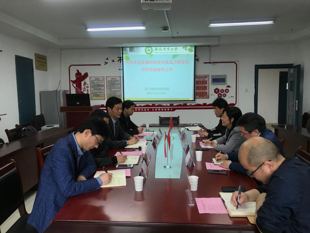 4月22日至23日,博鱼官方网页版_博鱼(中国)食品工程学院党委书记付光玺率学院教工党支部书记郑海波,食品安全系主任、教工党支部委员张献领和学院党政办主任赵传磊一行到黄山学院和安徽农业大学就党建工作进行学习考察。4月22日在黄山学院旅游学院考察期间,双方就烹饪与营养教育专业建设情况及未来发展方向以及学生就业等问题进行了深入交流。