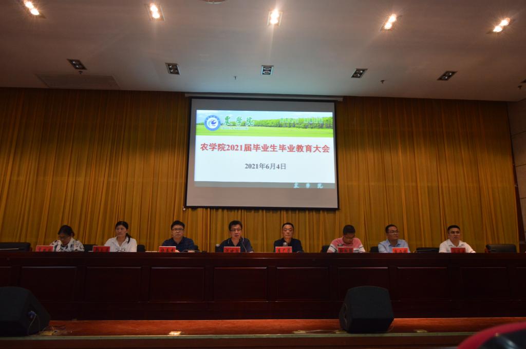 6月4日下午,农学院于会议中心二楼报告厅召开2021届毕业生毕业教育大会。农学院党委书记何世潮,党委副书记、院长崔广荣,党委副书记张轶辉,副院长舒英杰,团委书记、正科级辅导员郑玉莲,2017级设施农业科学与工程专业班主任贾双双博士,2017级植物保护专业班主任段海明博士及就业联系人汪道兵出席会议。农学院全体专兼职辅导员、2021届全体本科和研究生毕业生参加会议,会议由何世潮主持。
