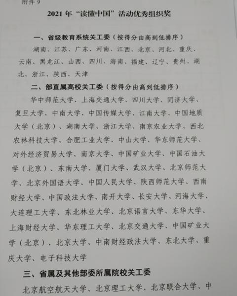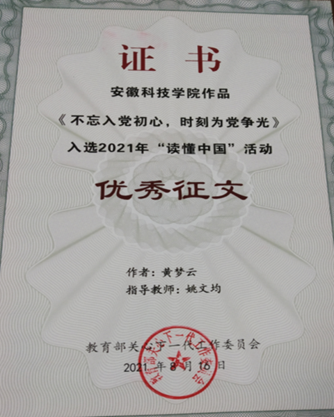 日前,在教育部关工委开展的 “读懂中国”活动中,博鱼官方网页版_博鱼(中国)关工委获2021年“读懂中国”活动优秀组织奖,选送的征文《不忘入党初心,时刻为党争光》获优秀征文奖。