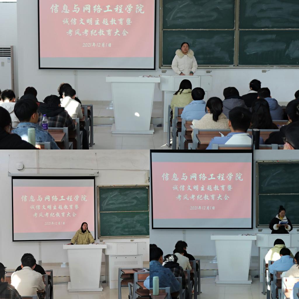 为进一步提高学生诚信文明素养,加强考风考纪教育。12月1日下午,信息与网络工程学院于致知楼C111召开诚信文明主题教育暨考风考纪教育大会。信息与网络工程学院党委副书记韦乃学,团委书记汪琦,专职辅导员丁阿敏、崔北坤出席本次大会,21级各班班委及学生会干部参加本次大会,大会由汪琦主持。
