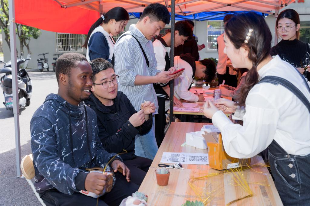 围坐一起的一众研究生中间,留学生也在认真观摩手工樱花的制作,与大家一起交流,体会制作技巧,耐心创作自己的手工作品。