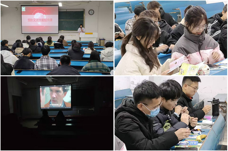 生命与健康科学学院青年志愿团白天在东区五四广场向同学们分发传单和宣传册,鼓励和邀请同学们在横幅上留下自己名字,积极加入共抗艾滋的活动中,并诚挚邀请同学们参加晚上预防艾滋病的同伴教育员培训讲座和观影活动。晚上在新知楼B304教室,青年志愿团为来自外国语学院、机械学院、动物科学学院等共计50余名同伴教育员开展预防艾滋病的技能培训讲座及观影活动。
