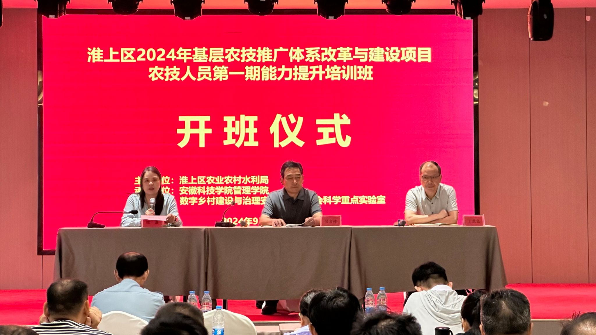 为深化基层农技推广体系改革,提升农技人员综合素质,助力蚌埠市乡村振兴。9月18日上午,由淮上区农业农村水利局主办,管理学院及数字乡村建设与安徽省哲学社会科学重点实验室联合承办的“淮上区2024年基层农技推广体系改革与建设项目农技人员第一期能力提升培训班”在蚌埠市淮上区举办开班仪式。淮上区农业综合服务站站长吴言柱,管理学院党委书记丁景良,副院长郑谦出席开班仪式,开班仪式由丁景良主持。