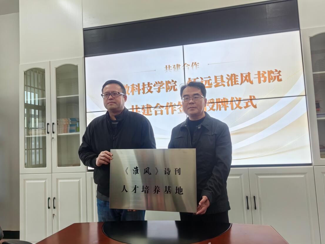 在签约暨授牌仪式上,李晓东、宫蔚国分别代表双方签署了共建实习实训基地协议,并举行“博鱼官方网页版_博鱼(中国)共建合作基地”“《淮风》诗刊人才培养基地”“ 《淮风》诗刊文学创作基地”授牌仪式。