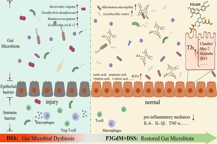 该研究通过深入实验,系统揭示了多酰基化花青素Peonidin-3-O-(3,6-O-dimalonyl-β-D-glucoside)(P3GdM)通过调节肠道菌群平衡、缓解炎症反应及修复肠道屏障功能的作用机制。研究表明,P3GdM能够显著改善DSS诱导的小鼠结肠炎的临床症状,降低疾病活动指数(DAI),并有效抑制促炎细胞因子和内毒素的过度产生。同时,P3GdM能够显著恢复DSS引起的肠道菌群失调,显著提高微生物多样性,增加了Akkermansia muciniphila和Lactobacillus reuteri等关键有益菌的相对丰度,并促进短链脂肪酸(SCFAs)和乳酸的生成。相关性分析进一步揭示了肠道微生物类群、促炎因子、临床症状、紧密连接蛋白以及SCFAs之间的密切关联。这一研究成果不仅为P3GdM作为结肠炎治疗的潜在干预手段提供了重要的科学依据,也为肠道健康的功能性干预提供了新的视角。审稿编辑高度评价了研究团队在功能性植物成分领域的创新成果,认为该研究具有重要的理论意义和实际应用价值。