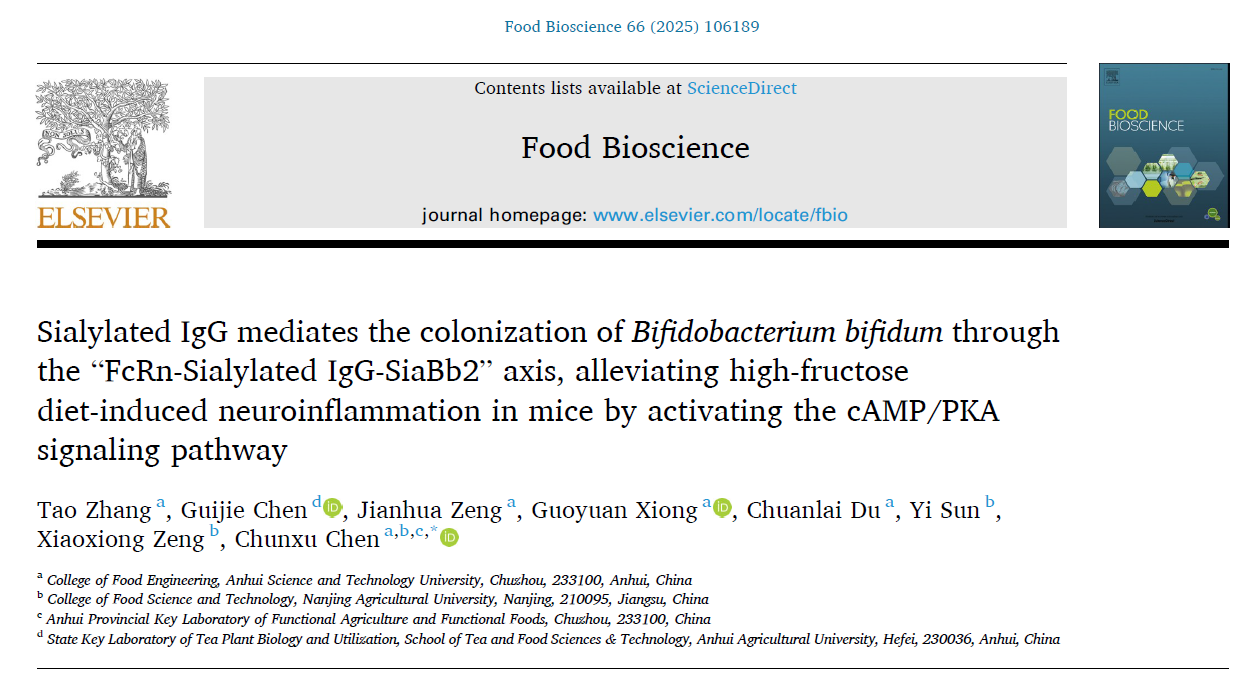 近日,食品科学与工程学院陈春旭副教授以通讯作者身份在国际Top期刊《Food Bioscience》(Q1,影响因子4.8)发表了题为“Sialylated IgG mediates the colonization ofBifidobacterium bifidumthrough the “FcRn-Sialylated IgG-SiaBb2” axis, alleviating high-fructose diet-induced neuroinflammation in mice by activating the cAMP/PKA signaling pathway”的研究论文,论文的第一作者为博鱼官方网页版_博鱼(中国)2023级食品加工与安全专业硕士研究生张涛,博鱼官方网页版_博鱼(中国)为第一完成单位,南京农业大学曾晓雄教授课题组为合作单位。