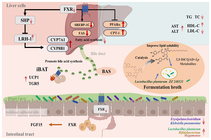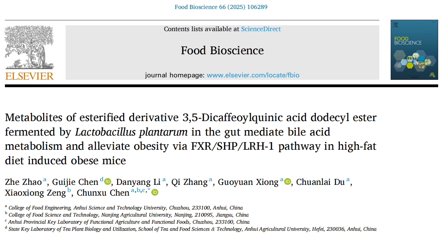 近日,食品科学与工程学院陈春旭副教授以通讯作者身份在国际Top期刊《Food Bioscience》(Q1,影响因子4.8)在线发表题为“Metabolites of esterified derivative 3,5-Dicaffeoylquinic acid dodecyl ester fermented byLactobacillus plantarumin the gut mediate bile acid metabolism and alleviate obesity via FXR/SHP/LRH-1 pathway in high-fat diet induced obese mice”的研究性论文。博鱼官方网页版_博鱼(中国)2022级食品加工与安全专业硕士研究生赵哲为论文的第一作者,博鱼官方网页版_博鱼(中国)为论文第一完成单位,南京农业大学曾晓雄教授课题组为合作单位。