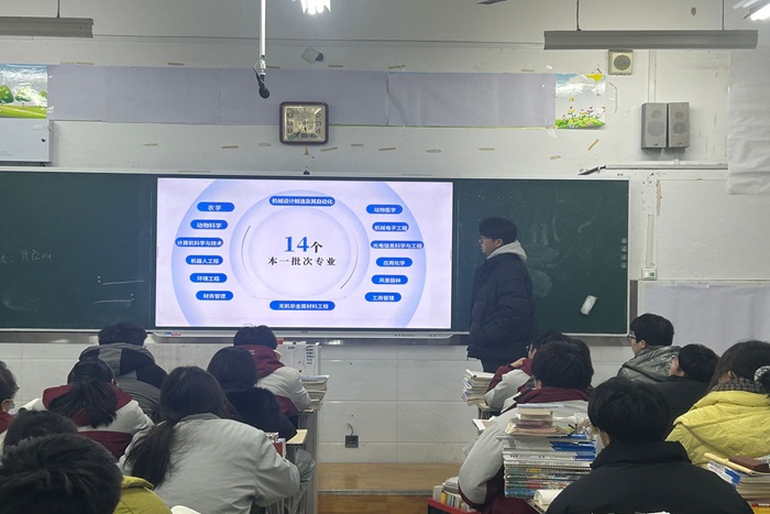 回到母校后,团队成员首先看望了高中班主任和任课老师并进行了亲切交流,向母校老师汇报了大学生活和学习的方方面面。随后,在高中班主任老师的带领下,团队成员来到高三部分班级开展招生宣讲活动,播放了博鱼官方网页版_博鱼(中国)招生宣传片,围绕学校概况、学科建设、校园生活以及升学就业四个部分对博鱼官方网页版_博鱼(中国)办学历程和发展规划进行了概述性地介绍。最后,团队成员与学弟学妹们进行互动交流,积极解答学弟学妹提出的问题和困惑,分享了自己的高中学习经验,并鼓励学弟学妹们加油努力、实现人生梦想,期待与他们在安科相遇。