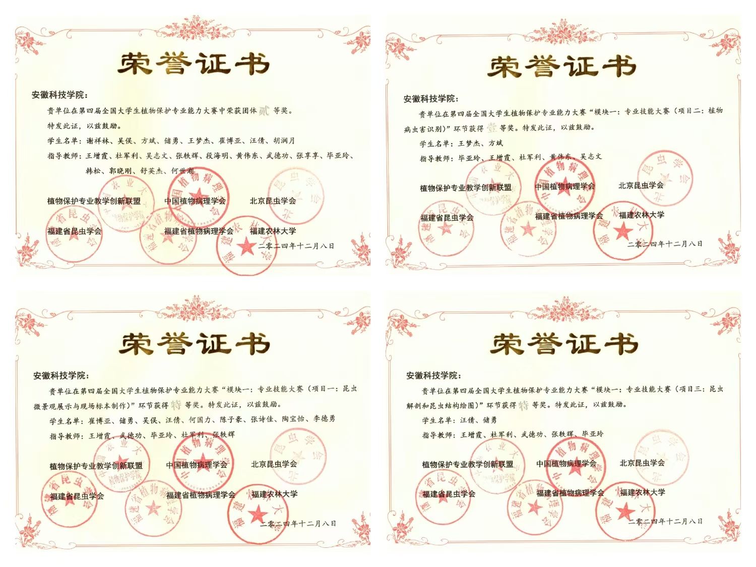 其中,汪倩同学的“昆虫解剖和昆虫结构绘图”项目以全国第一名的成绩获得特等奖,崔博亚和储勇等同学获得“昆虫微景观展示与现场标本制作”项目特等奖。王梦杰和方斌同学获得“植物病虫害识别”项目一等奖,胡润月获得“植物病理学实验操作和病原物结构绘图”项目二等奖,范晶晶和崔博亚获得“植物保护专业知识视频制作与展示”项目二等奖。方斌和谢祥林获得“创新创业优秀项目展示”三等奖,谢祥林和吴俣在“本科生学术交流报告”项目中获得三等奖。青年教师吴志文在“青年教师学术论坛”项目中获得三等奖。我校代表队最终荣获团体二等奖。