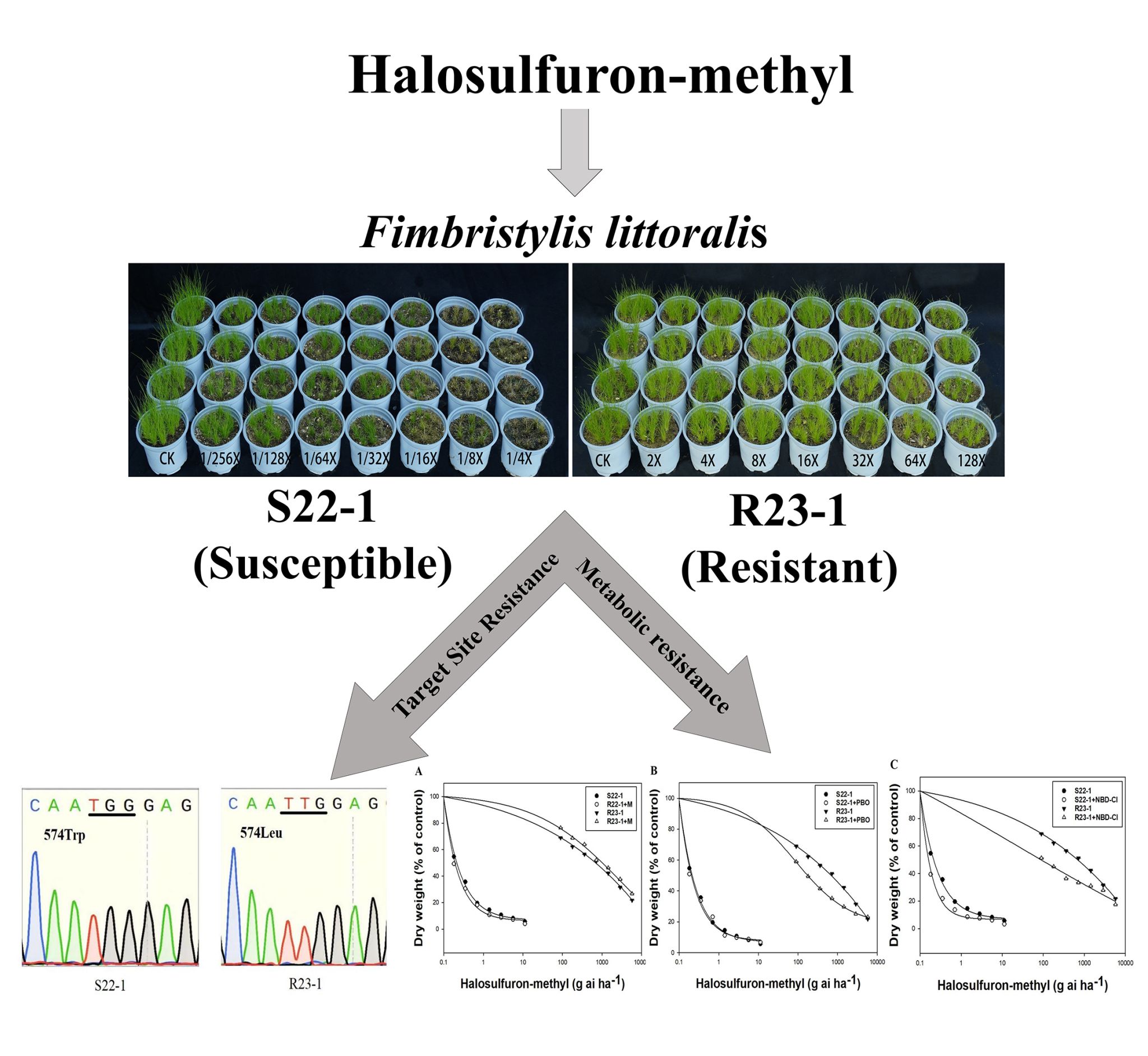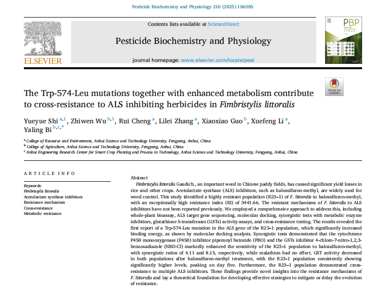 近日,我校农学院毕亚玲教授团队在国际知名期刊《Pesticide Biochemistry and Physiology》(中国科学院一区Top期刊,IF=4.2)发表了题为“The Trp-574-Leu mutations together with enhanced metabolism contribute to cross-resistance to ALS inhibiting herbicides inFimbristylis littoralis”的研究论文。该研究首次揭示了稻田恶性杂草水虱草(Fimbristylis littoralis Gaudich.)对乙酰乳酸合成酶(ALS)抑制剂类除草剂的抗性机制。硕士研究生史悦悦和青年教师吴志文博士为共同第一作者,毕亚玲教授为通讯作者,博鱼官方网页版_博鱼(中国)为唯一完成单位。