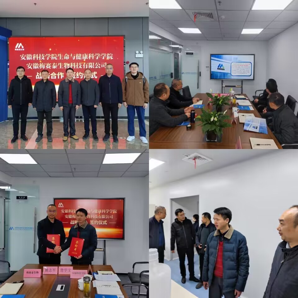 25日上午,在安徽梅赛泰生物科技有限公司,公司总经理熊志军等领导热情接待了詹学文一行。熊志军详细介绍了公司发展规划、科研团队、主营业务、人才需求等情况。詹学文简要介绍了学院的学科专业、师资队伍、科研团队建设、人才培养等方面情况。双方围绕科研合作、人才培养和毕业生实习就业等问题进行详细座谈并达成合作协议,并在公司会议室举行校企合作及就业实习基地签约仪式。随后在总经理熊志军的陪同下,詹学文一行参观了公司研发实验室和办公场所等。