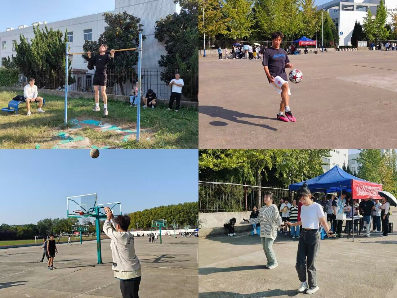本次趣味运动会包含六个项目:三分线定点投篮、足球90秒颠球、引体向上、一分钟跳绳、对墙垫排球以及仰卧起坐。赛前,运动员纷纷摩拳擦掌,积极热身;赛中,运动员们精神饱满、斗志昂扬。伴随着哨声一同响起的是同学们的欢呼呐喊,同学们加油助威的口号此起彼伏,眼中满含对运动健儿的鼓励和期待。篮球在空中划过一道优美的弧线,被精准的投进篮筐里;足球被运动员轻轻颠起,又乖巧的落回原处;排球和墙面一次次的精准撞击,这些都是同学们努力拼搏的最好证明。操场上热闹非凡,呐喊声、欢笑声使青春的气息弥漫在整个赛场。