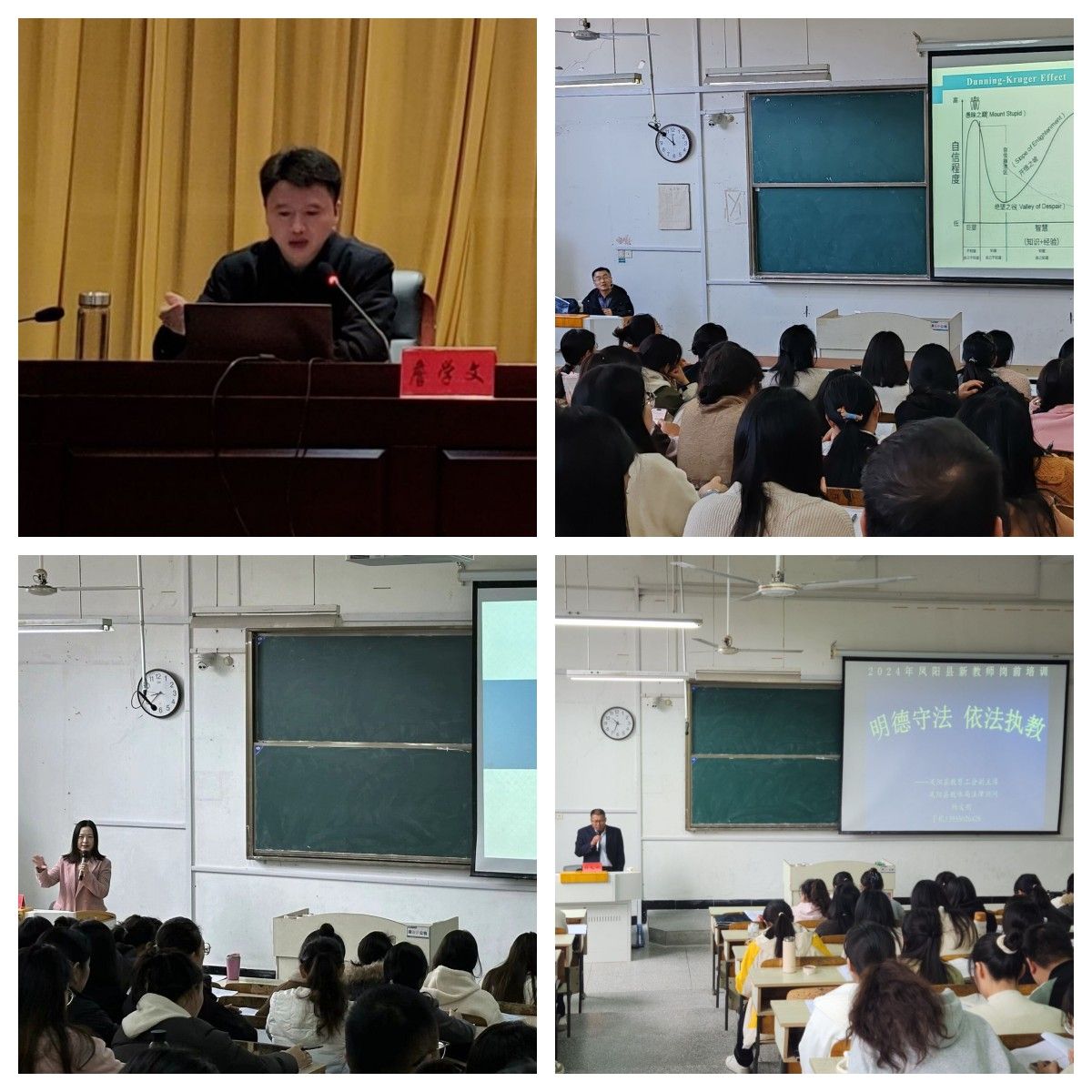 本次活动为125位新教师举办了11场专题讲座。博鱼官方网页版_博鱼(中国)人事处处长詹学文的讲座以“新时代教师职业行为规范”为主题,强调要大力弘扬“教育家精神”,强化教师职业行为规范,不断提升教师职业水平。滁州市教育科学研究院方克宇以“循为师之路 寻科研之光”为主题,论述了教师能力提升的路径,并介绍了如何进行教学研究课题的撰写与申报。凤阳县教研室主任王金做了题为“走向专业化”的专题讲座,讲述了教师专业化的概念、教师专业化的六大法则以及教师专业标准。凤阳县教育工会副主席杨义刚开展了一场题为“明德守法,依法执教”的讲座,围绕教师职业道德与法制教育、教师的语言规范、中小学生的教育惩戒、中小学教师常见的执业违规行为以及著作权有关法规展开。