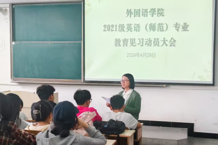 为扎实做好2021级英语(师范)专业见习工作,引导学生以良好的精神风貌迎接见习,4月29日下午,外国语学院在求知楼A203教室举行2021级英语(师范)专业教育见习启动大会。2021级英语(师范)专业全体学生参加本次会议。外国语学院党政领导和有关教师出席会议,会议由学院副院长洪民主持。