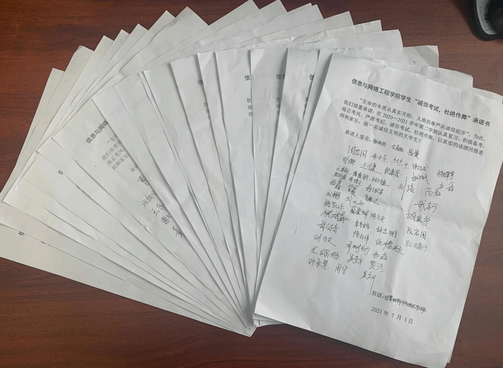 为确保将主题班会落到实处,学院专门制定《信息与网络工程学院考风考纪教育主题班会提纲》,准备了相关会议资料,要求各班辅导员按照提纲的内容和要求认真落实,精心准备。主题班会上,全体同学共同学习了《学生手册》中《博鱼官方网页版_博鱼(中国)考试工作实施细则(节选)》及《博鱼官方网页版_博鱼(中国)学生违纪处理方法》,开展了警示教育,按照《信息与网络工程学院诚信考试倡议书》的内容,发出了诚信考试倡议,希望同学们树立底线思维,积极响应学校的号召,手握诚信纸笔,书写高尚考风,坚决抵制各种舞弊行为,净化考场环境,展现自我真实水平,端正的考风、积极创造优良的学风。各班辅导员在总结时强调,诚信文明是立德成才的根本,是大学生必备的核心品质与基本修养,对大学生的未来职业发展、个人成才有着至关重要的作用。主题班会结束后,各辅导员组织全体学生签署了《信息与网络工程学院学生“诚信考试,杜绝作弊”承诺书》。