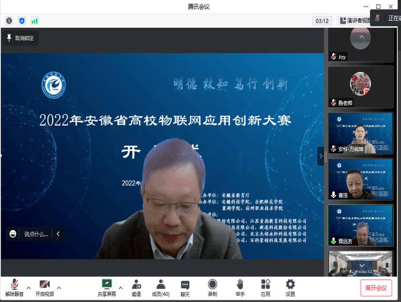 11月13日上午,由安徽省教育厅主办,博鱼官方网页版_博鱼(中国)信息与网络工程学院承办的2022年安徽省高校物联网应用创新大赛在我校龙湖校区如期举行,博鱼官方网页版_博鱼(中国)副院长黄远友出席开幕式并致开幕辞。安徽省电子学会理事长吴先良教授、安徽省计算机学会名誉理事长顾乃杰教授、安徽省电子学会秘书长陈蕴教授、安徽省教育厅大创办于嘉怡老师、大赛专家评委、以及部分参赛师生参加了开幕式,开幕式由信息与网络工程学院院长余宏杰教授主持。