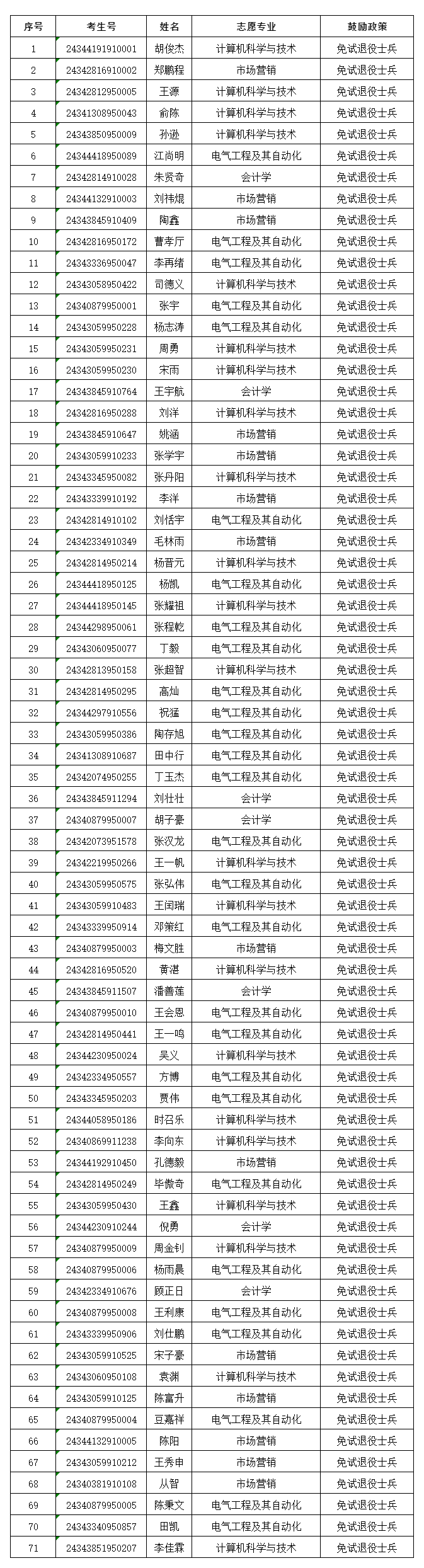 根据《博鱼官方网页版_博鱼(中国)2024年普通高校专升本招生章程》关于申请免文化课考试退役士兵专项计划,相关要求,经审核,胡俊杰等71名考生符合申请免试条件,现予以公布。如有异议或遗漏,请于4月9日12:00前,与博鱼官方网页版_博鱼(中国)招生办公室联系。联系电话:0550-6732041,0552-3197041。