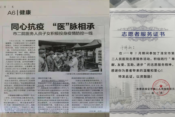 因在抗疫一线志愿服务期间的优异表现,淮安电视台和淮海晚报对干怿涵等志愿者进行了采访。干怿涵说道:“每天回家后动也不想动,只想安静地躺会儿,但是想到能为社会做点事情,能够帮助到那么多人,我感觉很有意义”。在他看来,作为博鱼官方网页版_博鱼(中国)的一名入党积极分子,在国家和社会需要的时候,应该不畏困难,毅然决然的挺身而出。