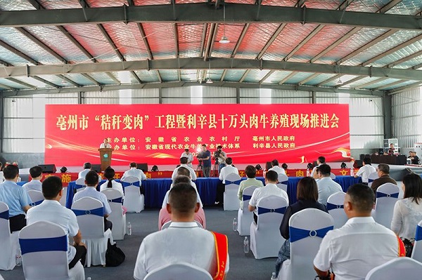 7月8日上午,由安徽省农业农村厅、亳州市人民政府主办,安徽省牛羊产业技术体系、利辛县人民政府承办的亳州市“秸秆变肉”工程暨利辛县十万头肉牛养殖现场推进会在利辛县望疃镇召开。安徽省副省长张曙光出席会议并宣布项目启动,亳州市委书记杜延安致辞。我校动物科学学院副院长、省牛羊产业技术体系首席专家华金玲教授、资源与环境学院李飞跃教授、动物科学学院吴学壮副教授等应邀参加本次活动。