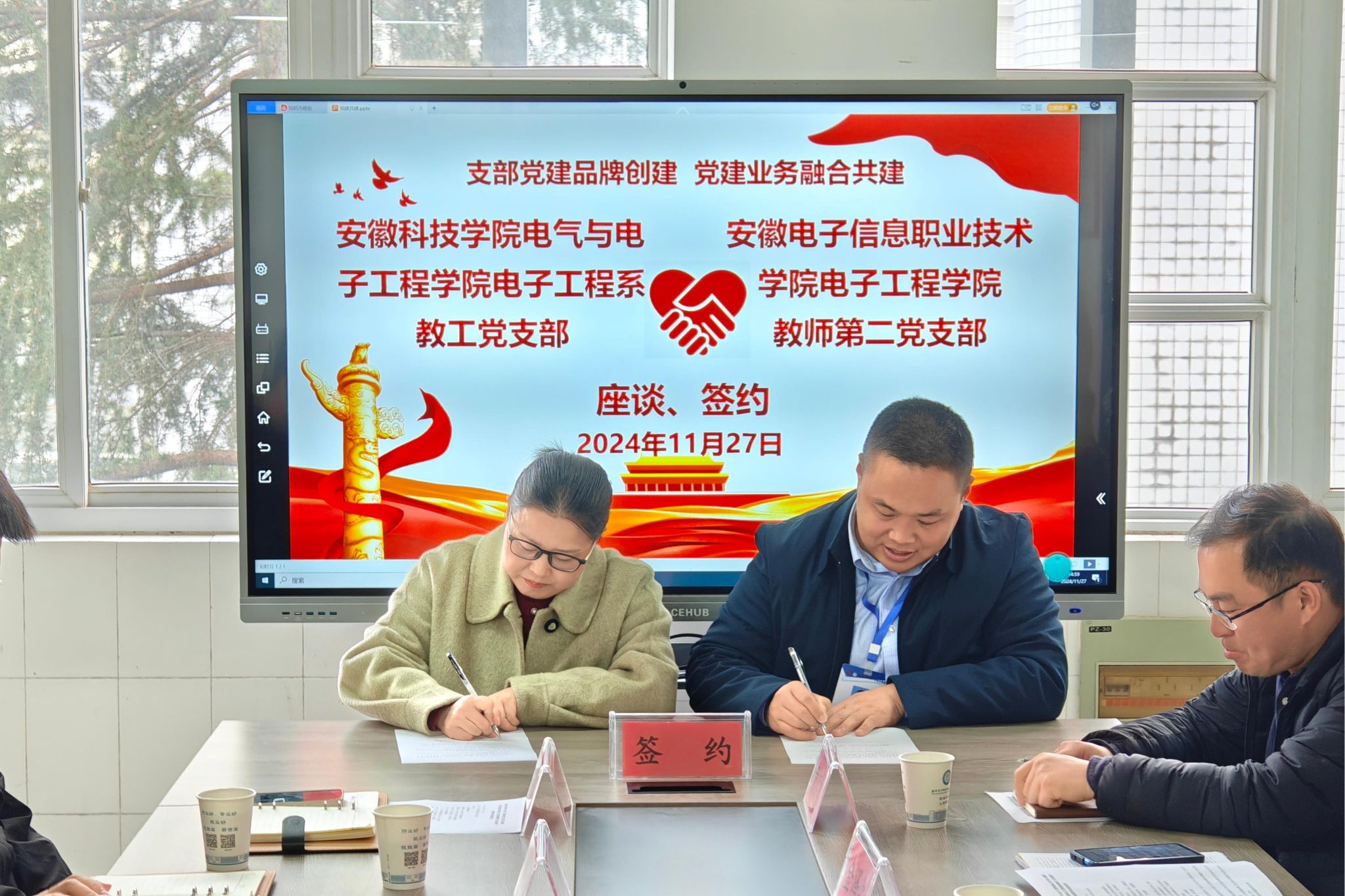 为拓宽高校基层党组织党建工作渠道,构建高校资源共享、相互促进、优势互补、共同提高的党建工作格局,2024年11月27日下午,博鱼官方网页版_博鱼(中国)电气与电子工程学院副院长樊晓宇及电子工程系教工党支部6名党员教师赴安徽电子信息职业技术学院与电子工程学院教师第二党支部开展结对共建主题党日活动。安徽电子信息职业技术学院电子工程学院院长方庆山参加了结对共建签约仪式。