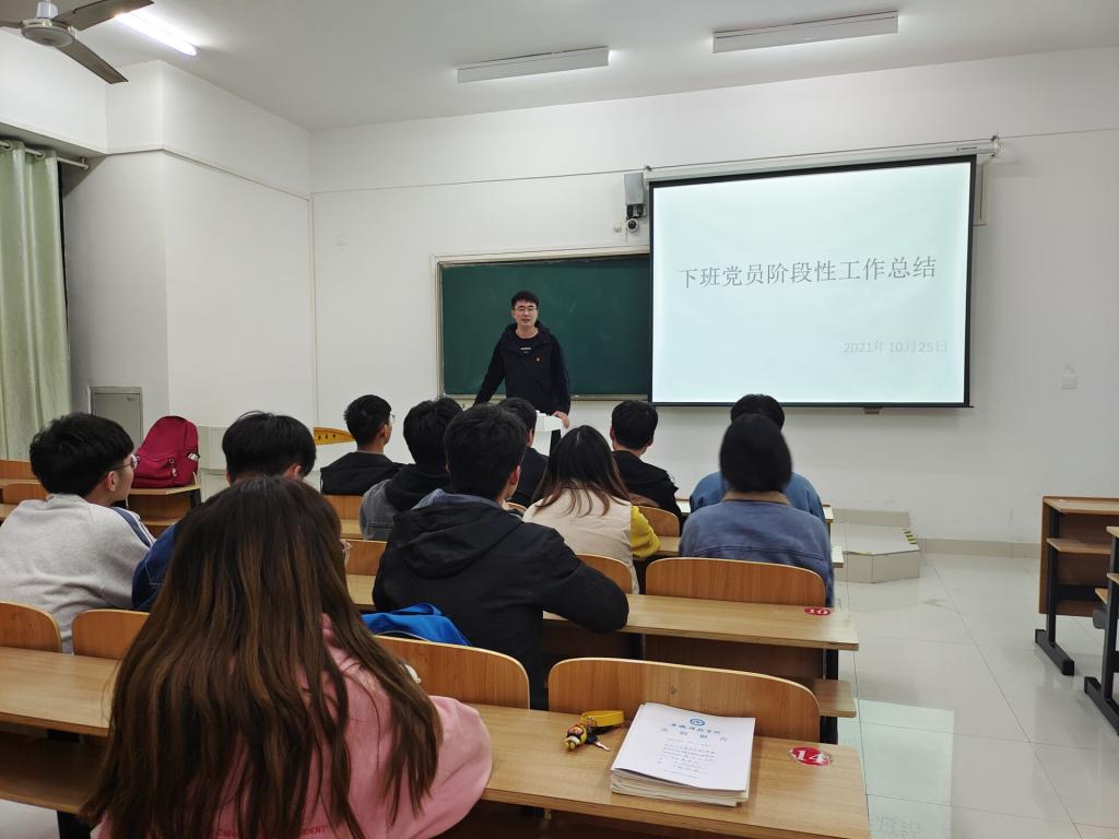 2021年10月25日晚,全体下班党员于致知楼C207召开了阶段性总结会议,支部宣传委员张海潮对各位下班党员宣讲进行总结,对各位党员宣讲阶段存在的问题提出了改进方法,同时要求宣讲内容要与实际相结合,充分融入新生群体,努力发挥党员的服务作用。