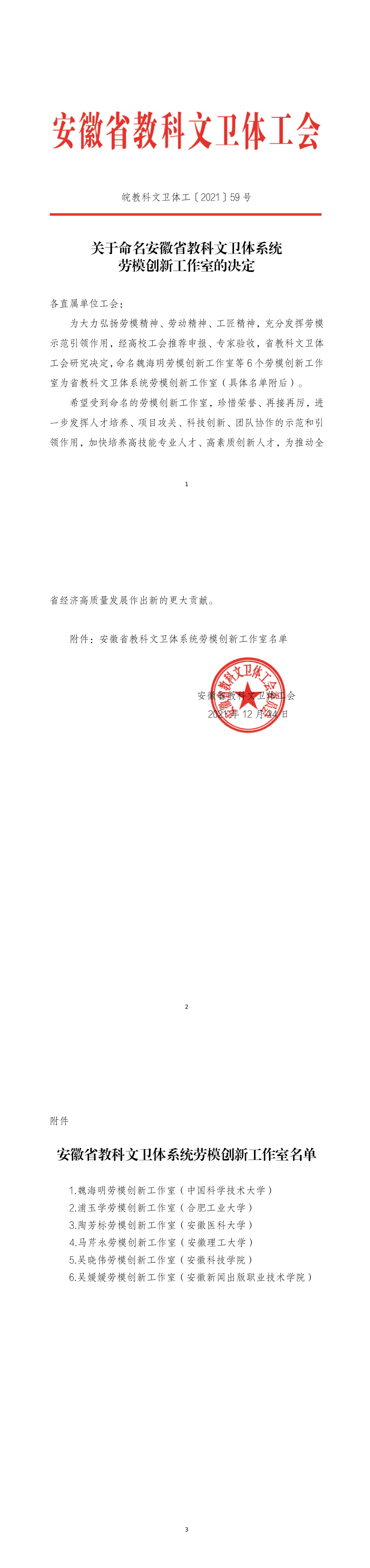 12月27日,安徽省教科文卫体工会下发《关于命名安徽省教科文卫体系统劳模创新工作室的决定》(皖教科文卫体工[2021]59号)文件,我校食品工程学院吴晓伟副教授领衔申报的“劳模创新工作室”荣获命名。