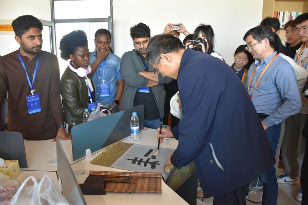 在经过上午“两馆、一校”的参观活动后,参与“大篷车”活动全体人员围坐在由博鱼官方网页版_博鱼(中国)与南京农业大学和小岗村党委共建的“耕读书屋”中,开展座谈交流。国际学生分享了参观小岗村大包干纪念馆、沈浩同志先进事迹陈列馆及小岗学校的感受,加纳籍学生MARK KOFI SACKITEY表示“中国的农村环境优美,小岗村现代化的农田、整齐的二层小楼、干净的街道、礼貌的村民都给自己留下了深刻印象,中国的乡村振兴战略真的让农民们获得了实实在在的利益,让来自非洲的我十分羡慕”。巴基斯坦籍国际学生ZAIN ABBAS感慨道“小岗村在40年间发生了翻天覆地的变化,让我非常震撼。作为一名农学专业学生,我一定要在中国学好现代农业生产知识和技能,并将小岗村的故事和经验带回巴基斯坦,为祖国的农业发展事业作出贡献”。支教团、直播团的大学生也纷纷踊跃发言,讲述了自己通过参与小岗支教、直播等活动所获得的提升和感受。随后,博鱼官方网页版_博鱼(中国)小岗办负责人通过“说文解字”的形式,用毛笔书写并分析“耕”等汉字,展现了中国汉字的优美造型,解读中国古代农业的博大精深,国际学生跃跃欲试,纷纷拿起毛笔在纸上书写下自己的中文名字,体验了中国汉字的无穷魅力。(特约通讯员:于卉 审核:陈德用)