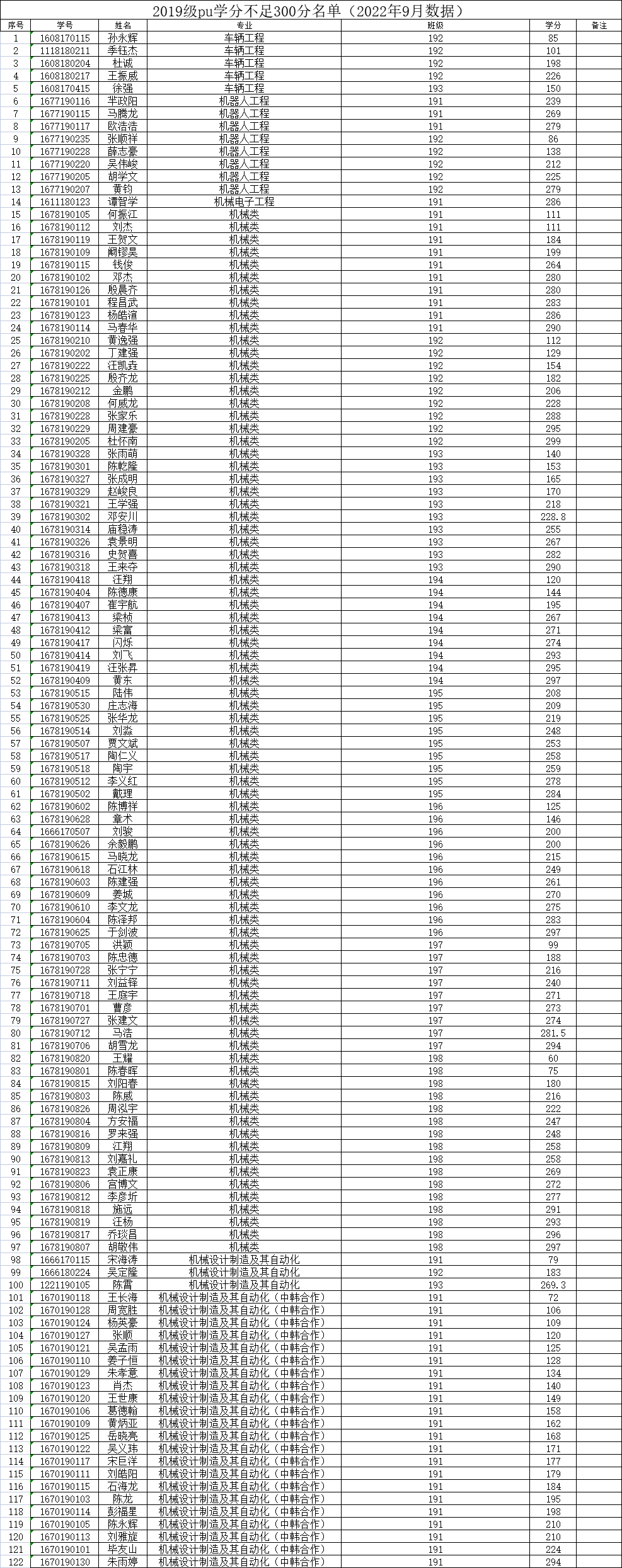 机械工程学院2022-2023-1学期二课堂学分(PU)未达标名单公示(2021级、2020级、2019级)