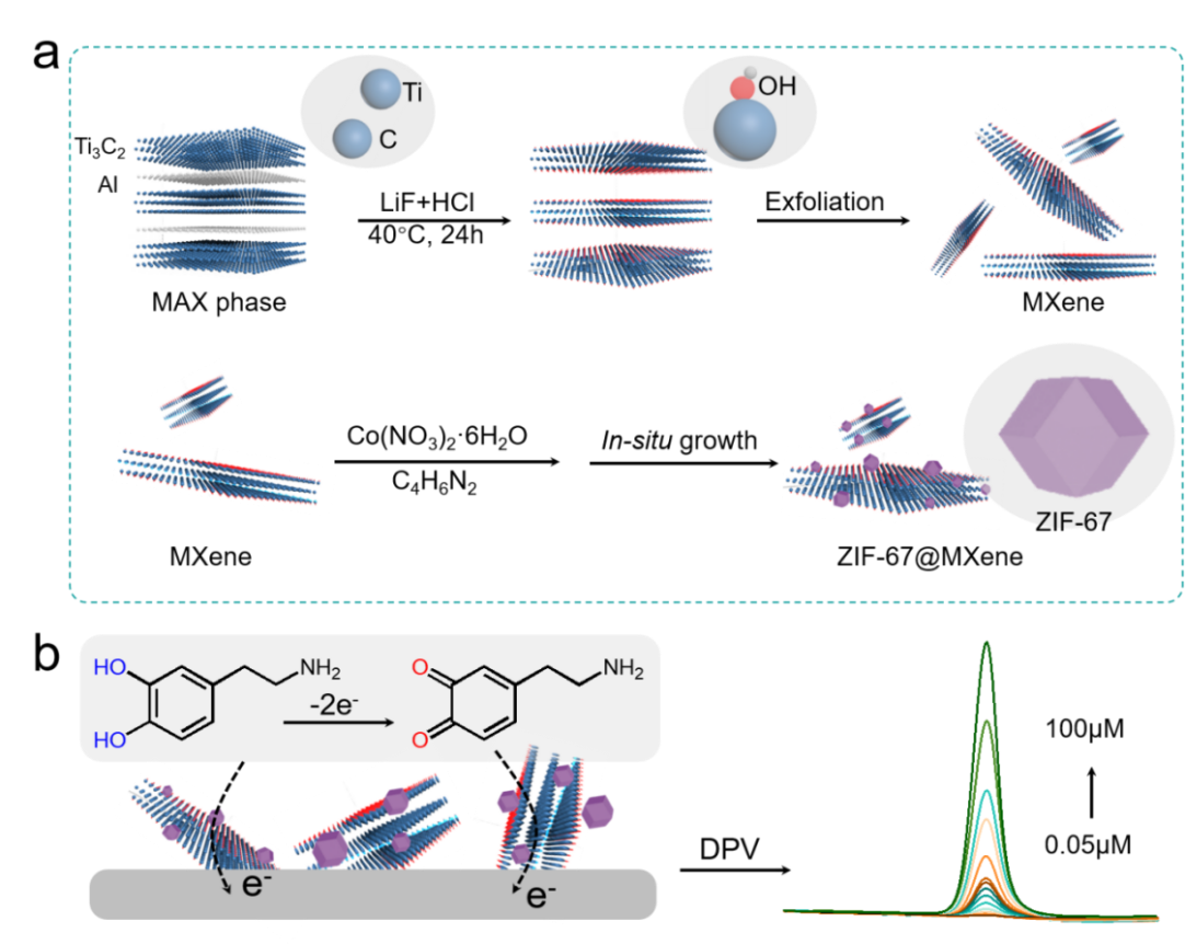 该论文创新性地开发了一种基于ZIF-67@MXene复合材料的电化学传感器,通过构建的独特结构,显著提升了材料的电子传输效率,并具有优异的抗干扰能力和稳定性。研究成果已成功应用于血清样本和商业多巴胺注射液的精准检测,为即时检测(POCT)和可穿戴健康监测技术提供了新的思路和方法。