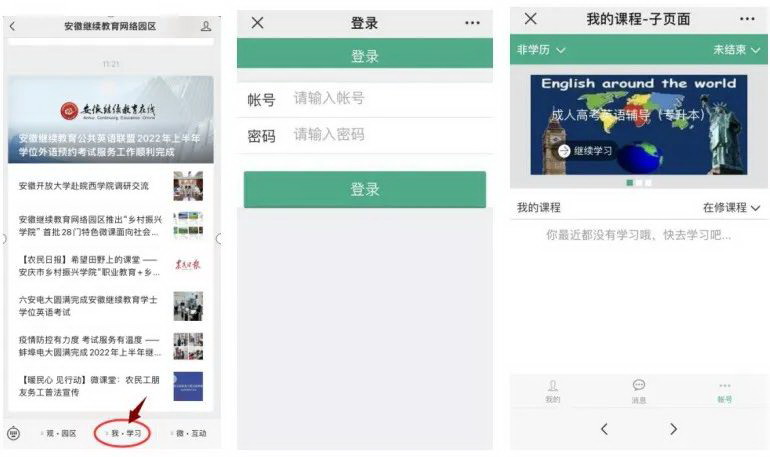 选择“我·学习”栏目,进入账号登录界面,输入账号及密码进入个人账号主页,选择课程进行学习。具体操作步骤如图6。