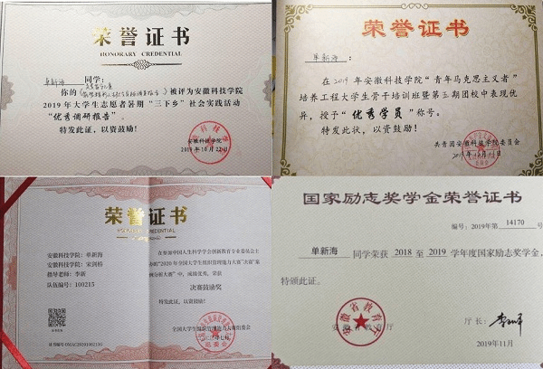 作为新时代的青年学子,单新海力求德智体美劳全面发展,大学入学至今共获得国家级奖项5项,省级奖项4项,校级奖项30项,院级奖项28项。2018年参加安徽省蚌埠市体育局招募的“言鼎华创”杯2018年全国青年游泳锦标赛志愿者工作,获得国家级志愿者荣誉称号。在2019年博鱼官方网页版_博鱼(中国)第五期青年马克思主义者培训中,单新海表现优异,作为优秀学员代表上台发言,并被安科小团、安徽青年大学生网等多方媒体报道。自新冠肺炎疫情发生以来,单新海积极响应学校以及学院的号召,为坚决打赢疫情防控的人民战争、总体战、阻击战奉献青春力量,获评“博鱼官方网页版_博鱼(中国)抗疫学生先进个人”荣誉称号。此外,单新海还就新冠疫情开展云调研,近万字的调研报告《蔚来智能崛起的一波三折—基于蔚来公司的社会调研与案例分析》不仅让整个团队实践效果突出,同时也获2020年全国大学生组织管理能力大赛决赛奖项,并收到主办方致蔚来的推荐信。单新海基于新冠疫情申报的大学生创新创业训练项目更是获得国家级立项,相关事迹被安科小团公众号、博鱼官方网页版_博鱼(中国)校园网报道。2020年9月,单新海被学校推选参加省级三下乡优秀实践个人、省级三下乡优秀调研报告的评选活动。