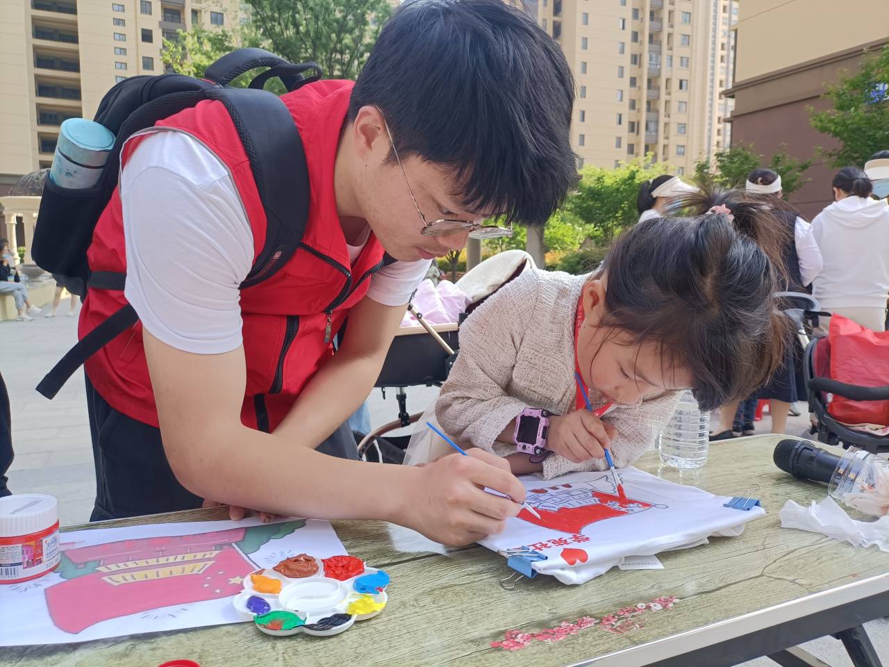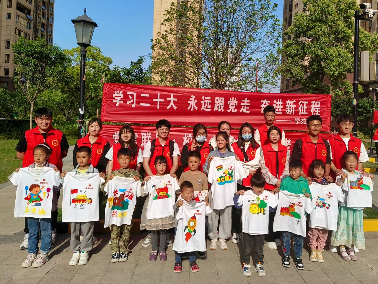 活动现场,建筑学子以绘画、T恤涂鸦等别具一格的方式引导社区儿童向英雄学习,在心中深深埋下红色基因的种子。活动过程中,孩子们围绕活动主题,充分想象大胆创作,互相交流自己的创作思路,志愿者们也在一旁指导他们如何更好地表达自己的想法,活动现场井然有序,充满童趣。